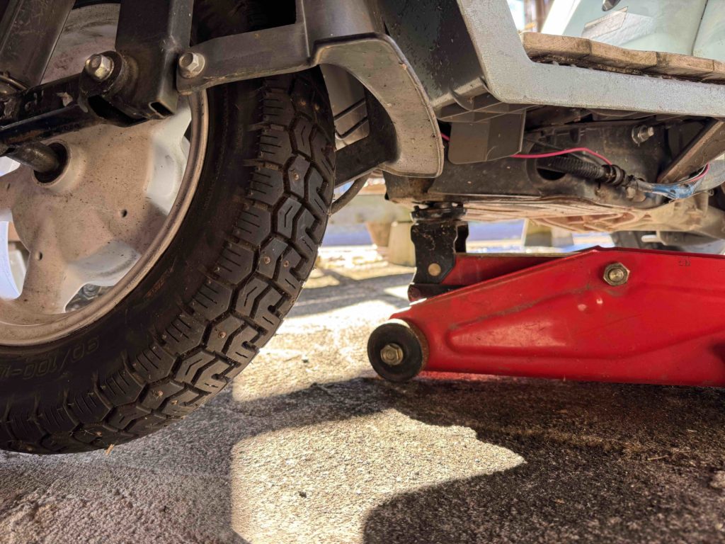 フロントタイヤの取り外しには、ジャッキアップが必要になる。