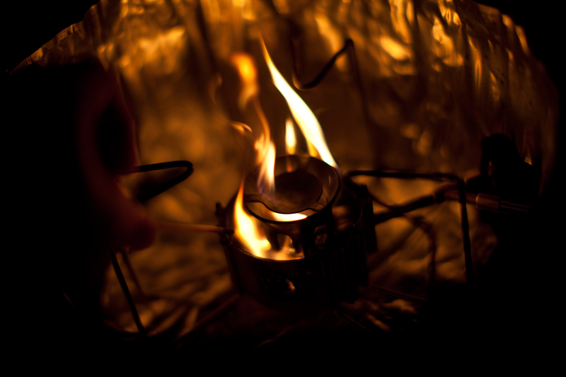 ドラゴンフライを野営場に備え付けられている木製のテーブルの真ん中に置き、バルブをわずかにひねる。皿に、BAJACOからいただいたガソリンをほんの指先ぶん。少し湿ったマッチから火を移すと、赤が揺れ、上皿の金属がじわりと熱を拾いはじめる。少し煙が目に染みて匂いは鋭いが、すぐに落ち着くことを私は知っている。